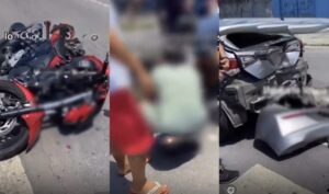 As imagens também revelam que a traseira do carro ficou totalmente destruída, evidenciando a força da colisão. A motocicleta, de cor vermelha, ficou caída na pista e bastante danificada.