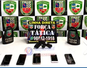 A Polícia Militar do Amazonas (PMAM), por meio da Força Tática, prendeu um jovem de 20 anos e recuperou cinco celulares roubados, na noite de terça-feira (09/12), no bairro Novo Aleixo, zona Leste da capital. A ação também resultou na apreensão de um simulacro de arma de fogo e de uma motocicleta usada nos delitos.